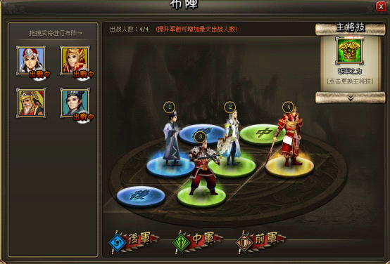 竞技场中不败的法则是知己知彼,对于敌方的弱点进行有效打击。前军绝对不会成为弱点,因此我们要绕过千军直接对敌人中军和后军进行据对打击。