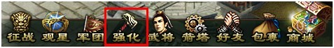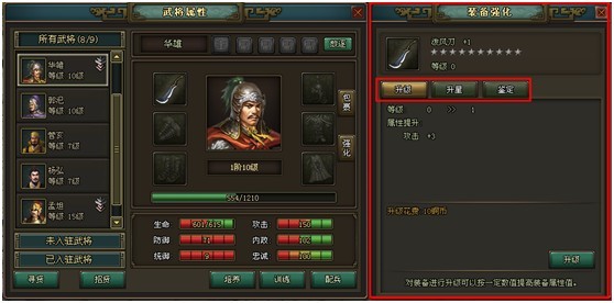 点击菜单“强化”,或者“军器监”—“装备强化”,打开装备强化界面。在这里选择武将,点击武将装备上的武器,就可以对装备进行升级、升星、升级、鉴定。